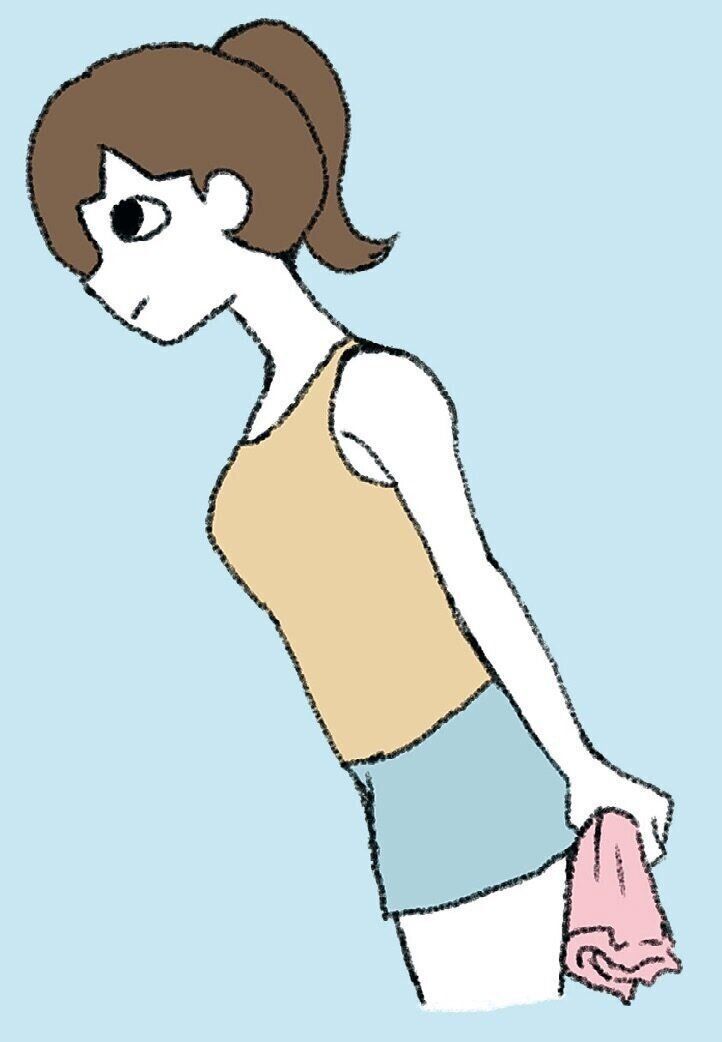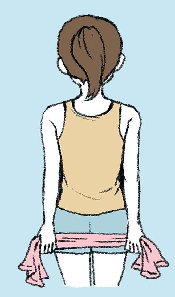 腕を後ろに回し、手のひらを前向きにして、腰幅くらいでタオルを握る。