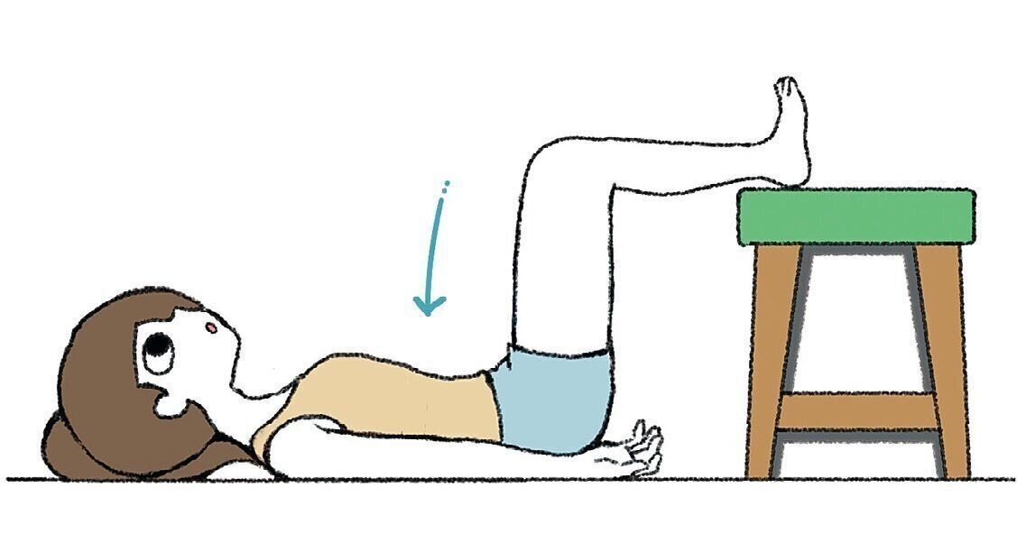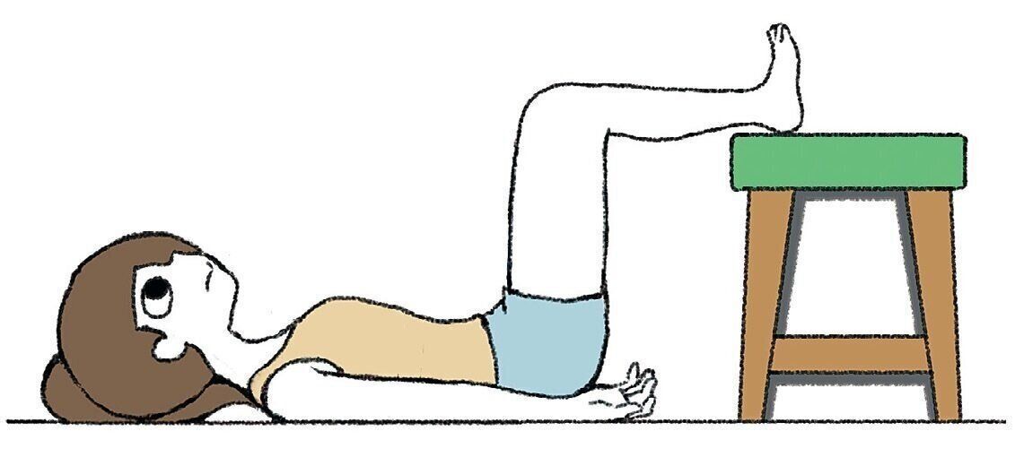 あおむけになり、台やいすの上にかかとをのせ、足は腰幅に開く。手のひらは上向きに。