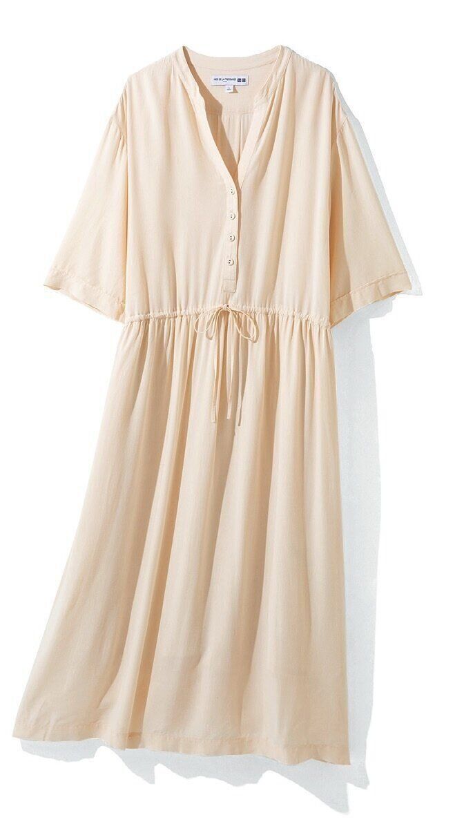 中に長そでのタートルネックを着れば今すぐ使えるし、タンクトップやキャミにすれば夏もOK。シルエットもかわいい。「レーヨンギャザーワンピース」(ナチュラル、ブラック、イエロー・全3色)/ユニクロ/イネス・ド・ラ・フレサンジュ