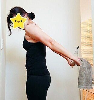 二の腕タオル綱引きをやると肩甲骨まわりが軽くなりました。2週間後、反り腰が直って、体重も1kg減っていて驚き!変化を実感できたので、継続していきます。