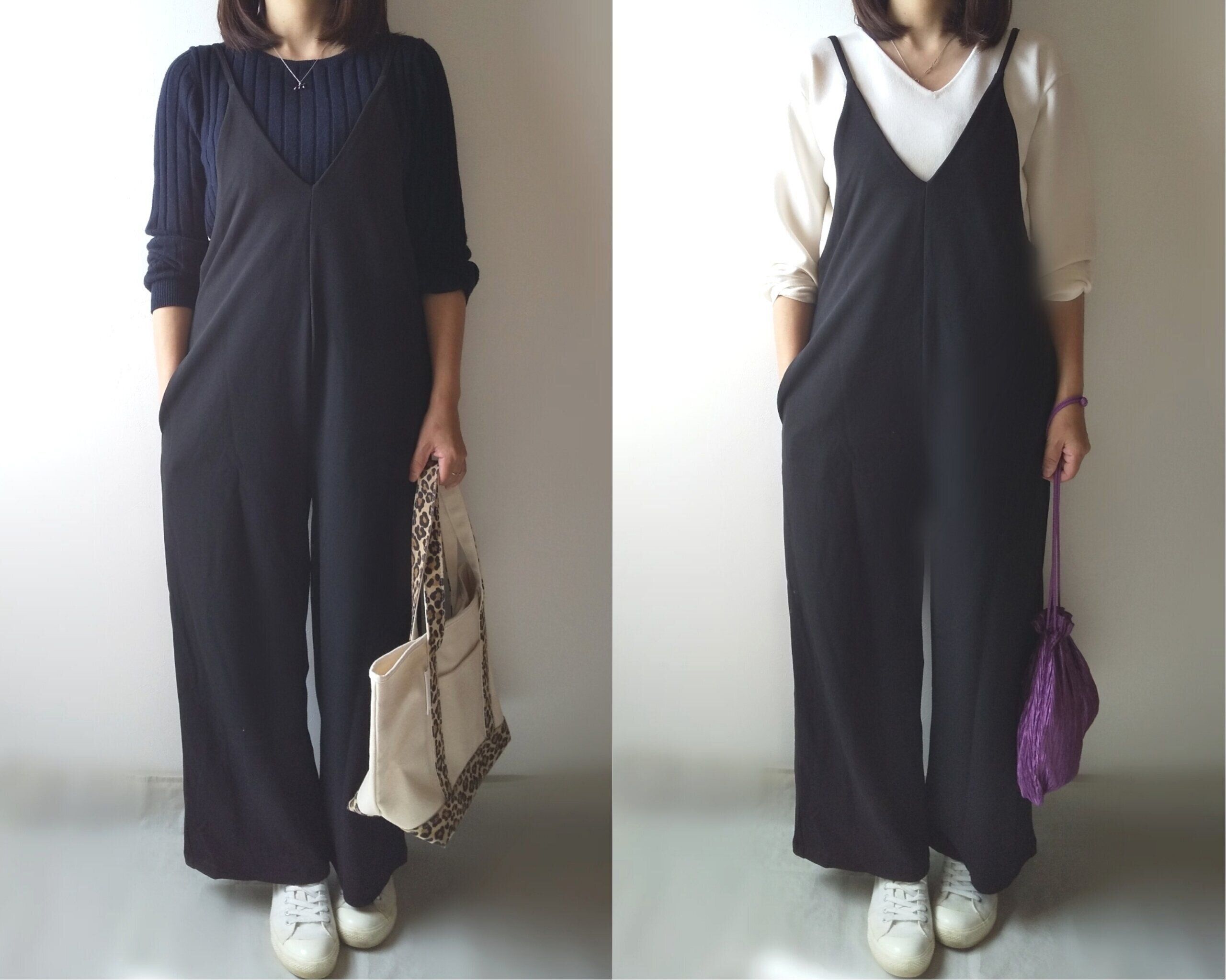 ダークカラーのトップスと合わせると、サロペットとのコントラストが弱まるので、カジュアル感が薄れます。サロペットを着るのはちょっと抵抗ある、という人もこれなら着やすいと思います。白トップスよりもシックで大人っぽい印象になりますね。