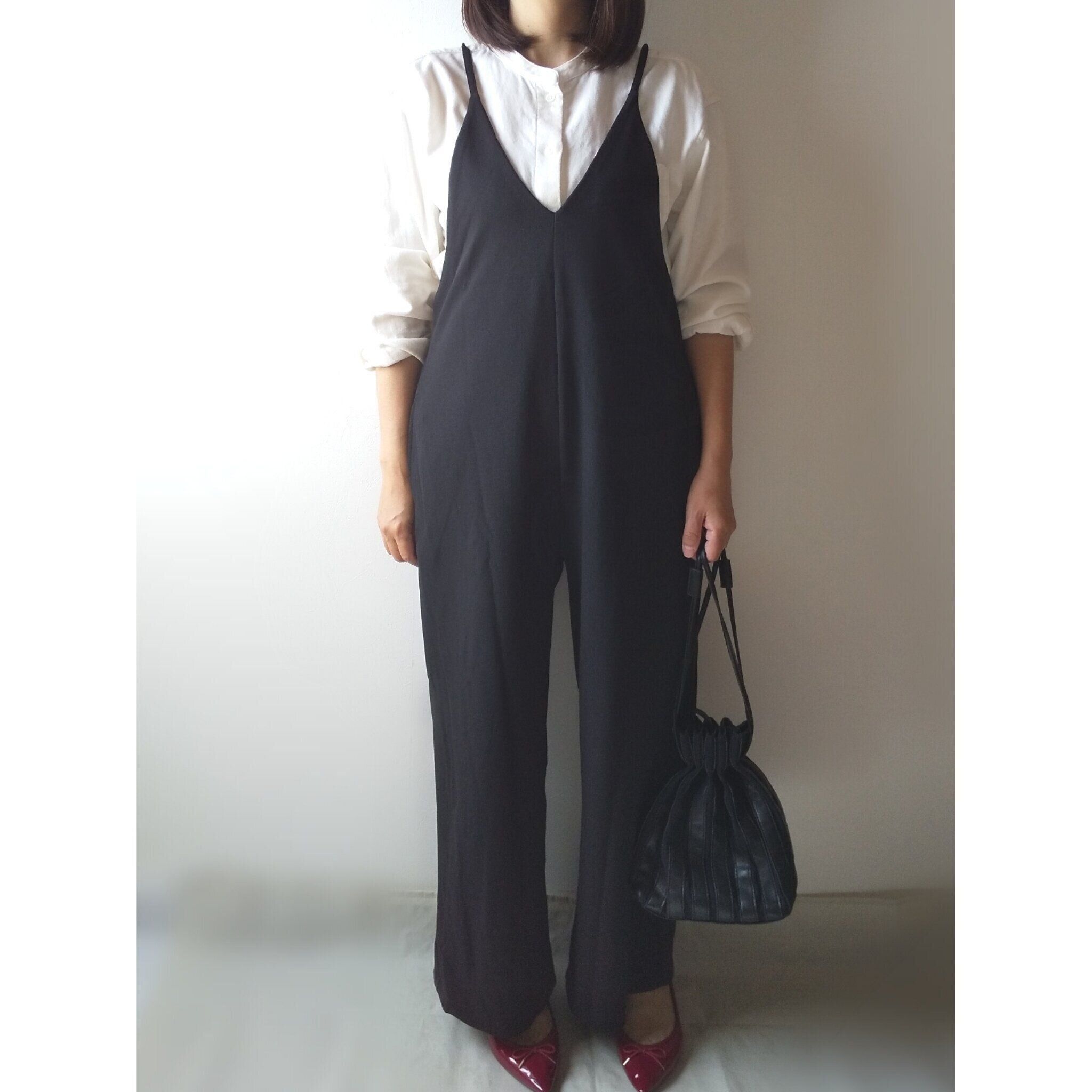 cocaにはサロペットがいくつか販売されていますが、今回購入したのは「抜群ストレッチゆったりオールインワン」(2,629円)。相変わらずのプチプラですが、生地はジョーゼットのような落ち感のある素材で高見えします。購入の決め手となったのは、細いストラップと胸元のVライン。これなら大人っぽく着られそう♪それから、背中のストラップがV字になっているので肩からストラップが落ちにくそうな点も◎。肩のストラップが落ちてくるとプチストレスになってしまうので、大事なポイントです。
