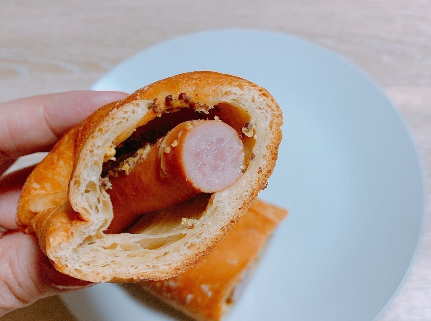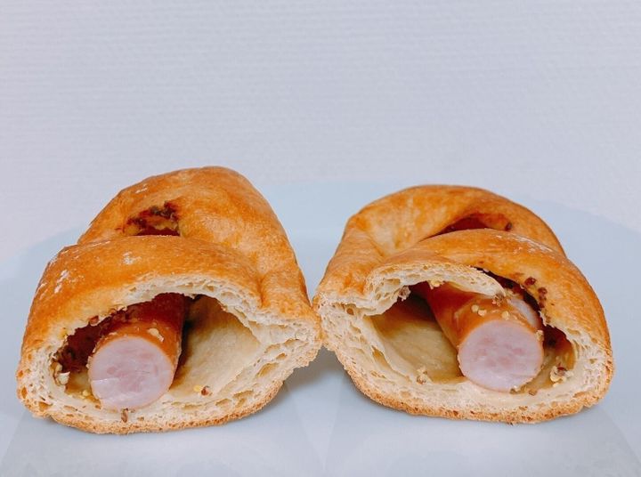 もち麦パンの中身は、あらびきソーセージと粒マスタードのみというシンプルな構成。切ってみると、ちょっと中身の隙間が気になりました。