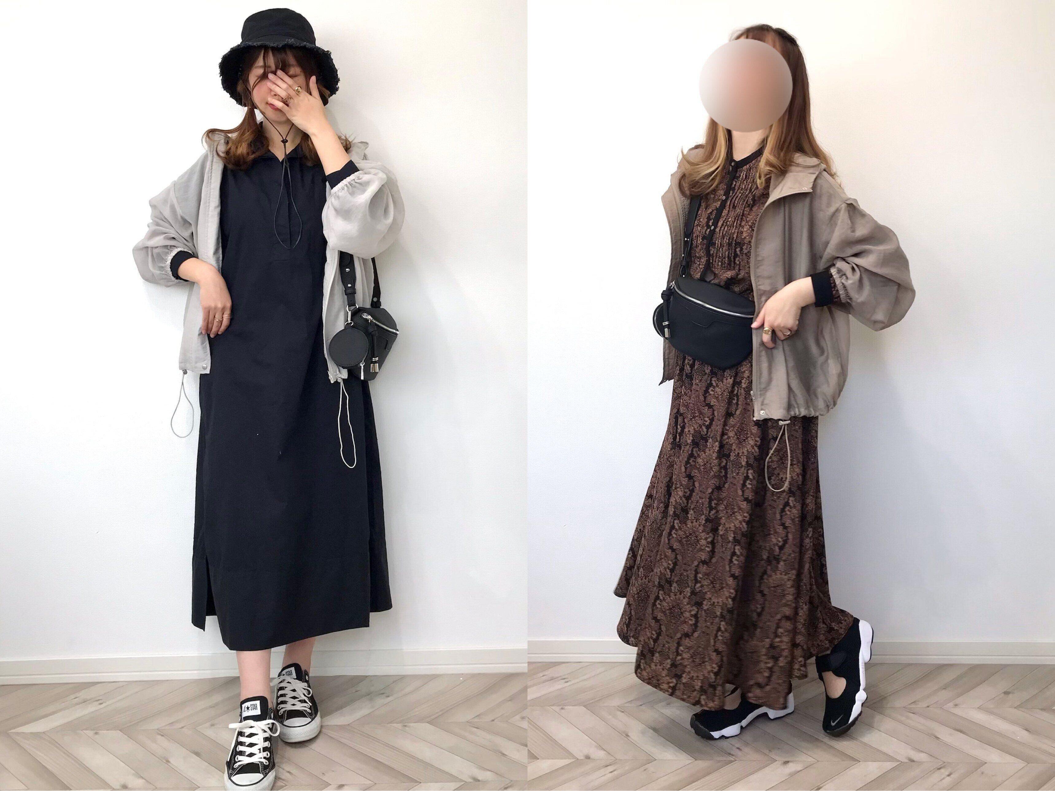 マウンテンパーカーとバケットハットってセットで合うイメージだったので合わせてみました。右側のコーデはダマスク柄ワンピースもブラウンなので全体的に落ち着いた大人っぽい雰囲気です。