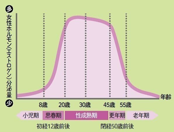 一生を通じて女性ホルモンの恩恵を受けている女性の体。しかし主役のエストロゲンの分泌量は年齢ごとに劇的に変化し、だれでも更年期の前後からガクンと減少します。