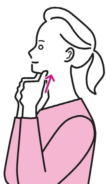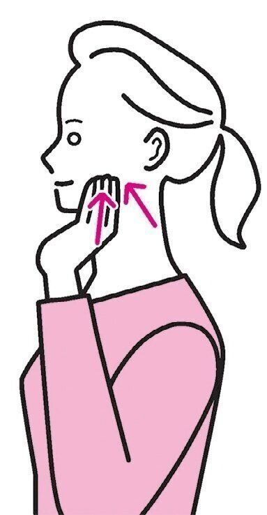 (2)耳下から顎の先にかけて、4~5カ所に分けて4本の指で軽く押す。