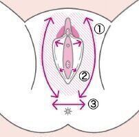 オイルをデリケートゾーン全体になじませ、(1)大陰唇、(2)小陰唇、(3)会陰の順番で、指の腹で矢印のようにマッサージ。最後に膣の中に指を入れて、内側をなぞります。