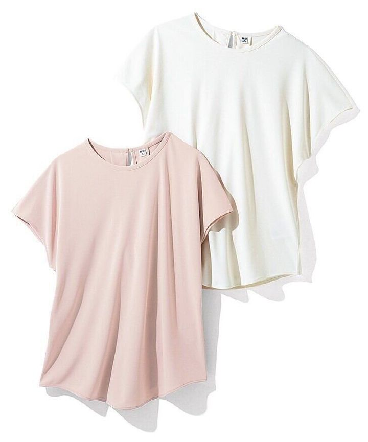しわになりにくく、自然なストレッチ性を持つ素材。通気性がよく、速乾性も高いのでガンガン洗って着回せる。「クレープジャージーフレンチスリーブTシャツ」(ピンク、オフホワイト、グレー、ブラック、ネイビー・全5色)/ユニクロ