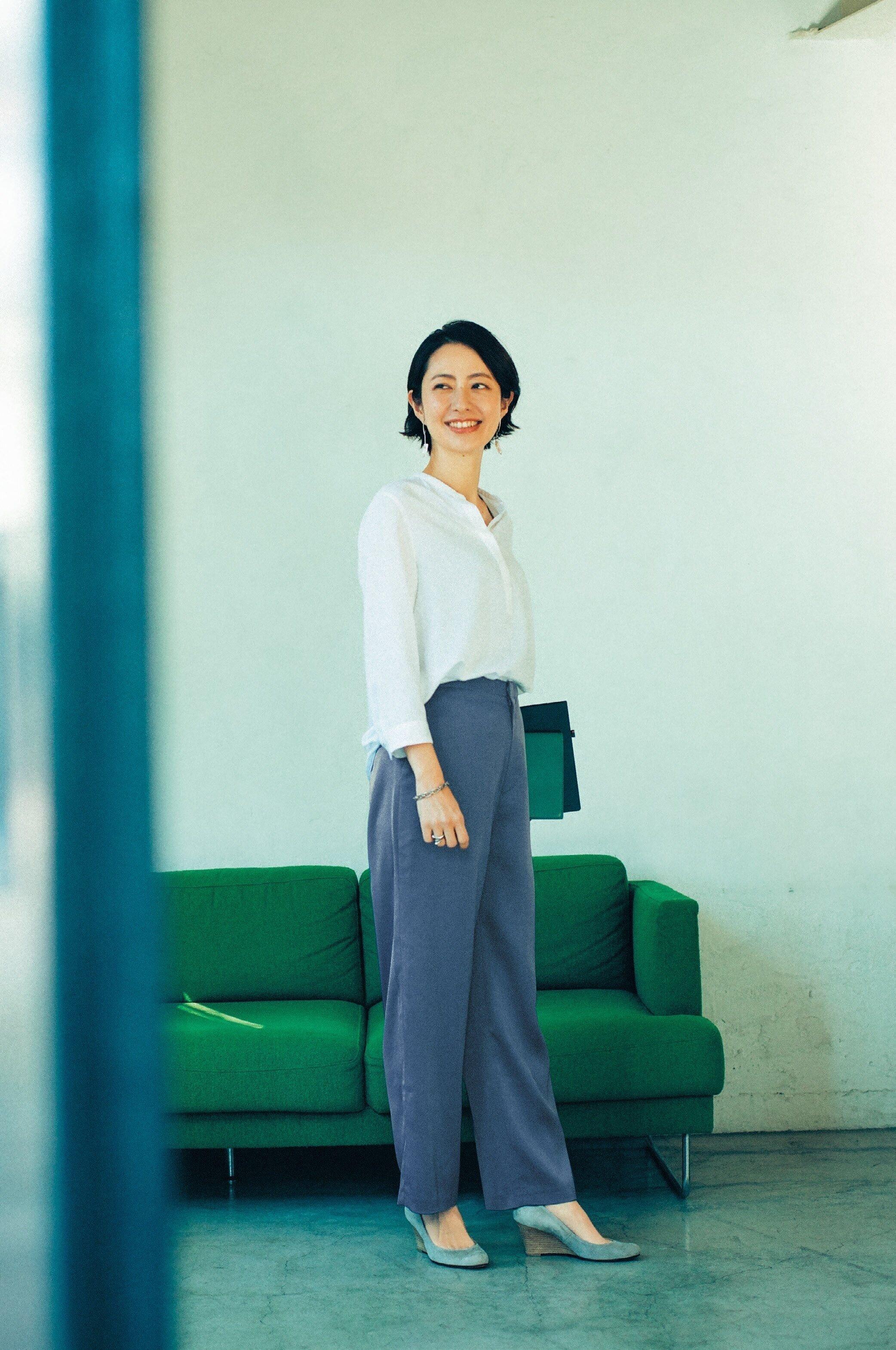 家にいながら仕事相手と画面越しでつながるオンライン会議。「通勤服よりちょっとラクな物を選びたい」という人におすすめの服を林さんが発見。「アイロンなしで着られるブラウスは家事に追われる私たちにとって、ありがたい存在(笑)。とろみがあって着心地のいい素材と品のいい襟もとが40代女性にぴったりの1枚です。七分袖なのでシーズンレスで使えるのも◎。色違いでそろえたくなる優秀なアイテム」。