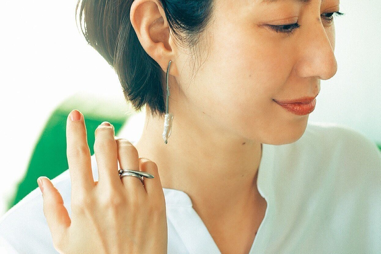 特徴のあるピアスは、オンラインで映えるイチオシアクセサリー。パールなら上品さも演出できます。意外と手もとが見えるので、太めの指輪で存在感を。