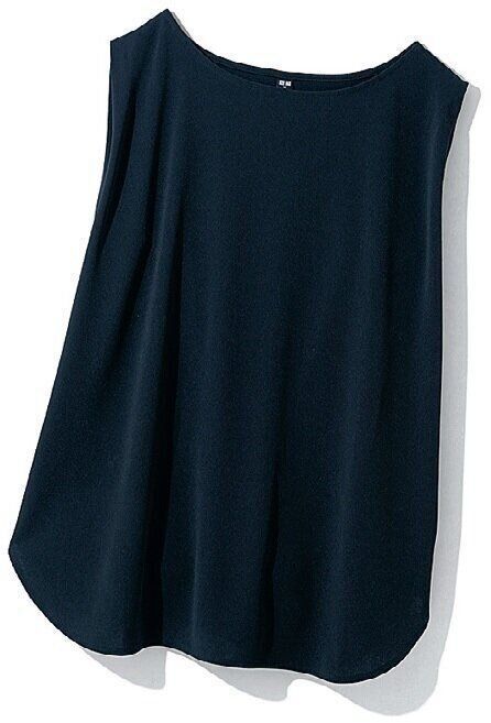 脚のラインを拾わない絶妙な太さ。ウエストの背中側がゴムなので、はき心地がとことんラク。上のノースリーブとセットアップとしても使える。「クレープジャージーストレートパンツ」(ブラック、ライトグレー、グレー、ブルー・全4色)/ユニクロ
