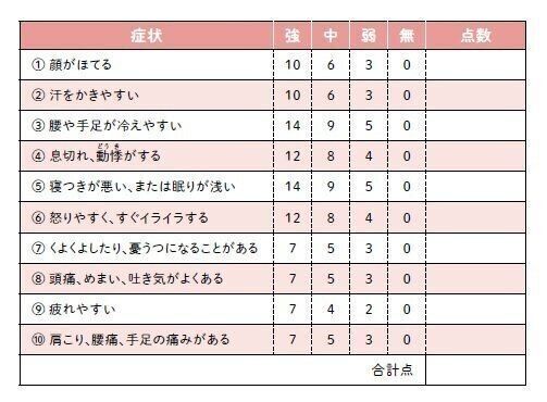 全国の医療機関で使われている更年期指数。(1)~(10)の項目で当てはまる強度のもの1つに〇をして点数を記入し、合計点を出そう。
