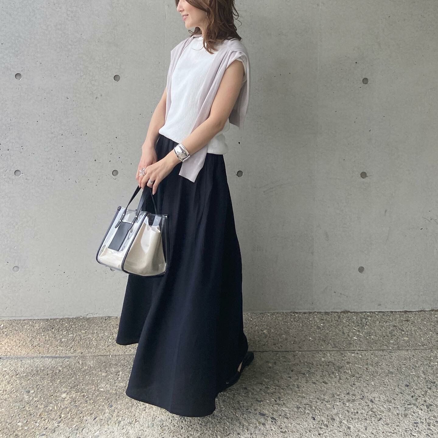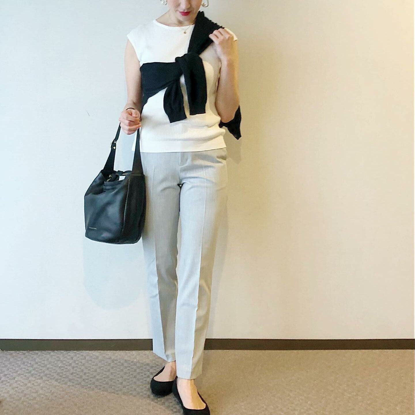 すっきりシンプルで大人っぽく見えるモノトーンコーデ。フレンチスリーブのシルエットがくっきり際立ちハイセンスな印象に。リブニットの凹凸はもちろん、ピタッとしすぎない、ほどよくゆとりのあるサイズ感も華奢見え効果に一役買っているのです。