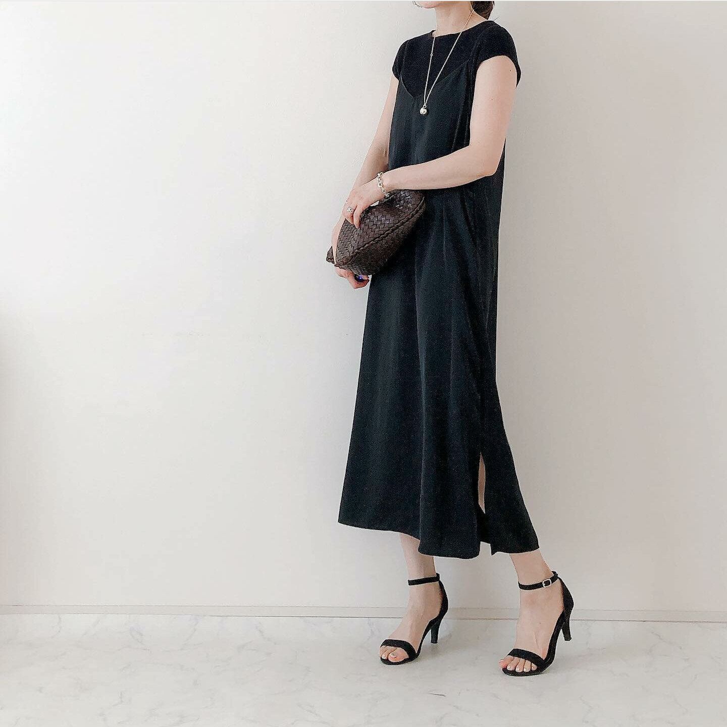 ユニクロの「キャミソールサイドスリットロングワンピース」と黒でつないだオールブラックコーデです。リブニットの凹凸感でオールブラックでも奥行きがアップ!さらに黒なら高見え感もアピールできます。