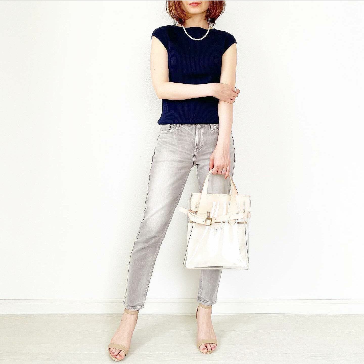 パールネックレスを加えてもきれいめな印象で着こなせます。デニムでも上品に見せたいときはパールネックレスを頼りに。