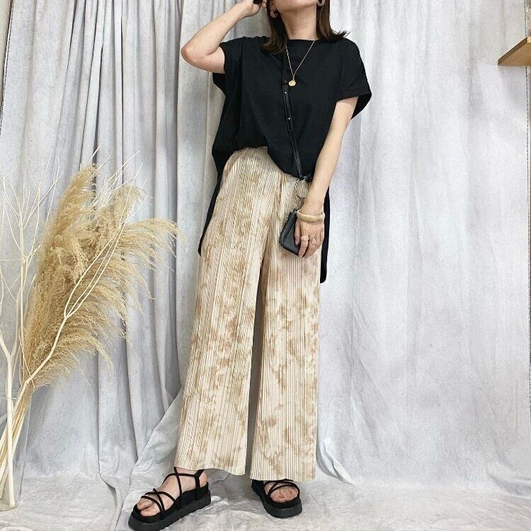 万能カラーの黒を合わせることでコーディネートにメリハリがつき、パンツの存在感を主張したファッショナブルなコーディネートが完成します。