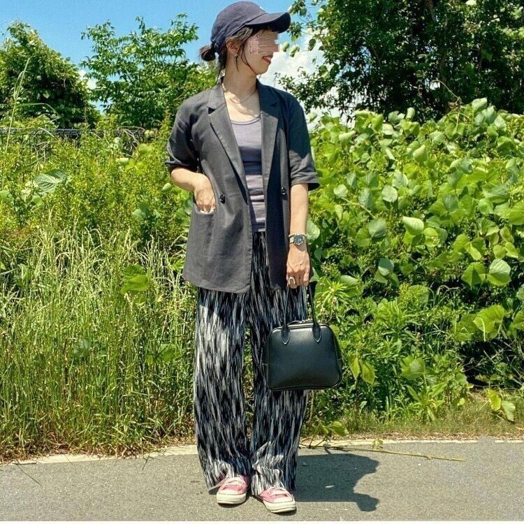 リラックススタイルになりがちな夏の柄パンツですがジャケットを合わせることでメリハリのあるハンサムコーディネートが完成します。