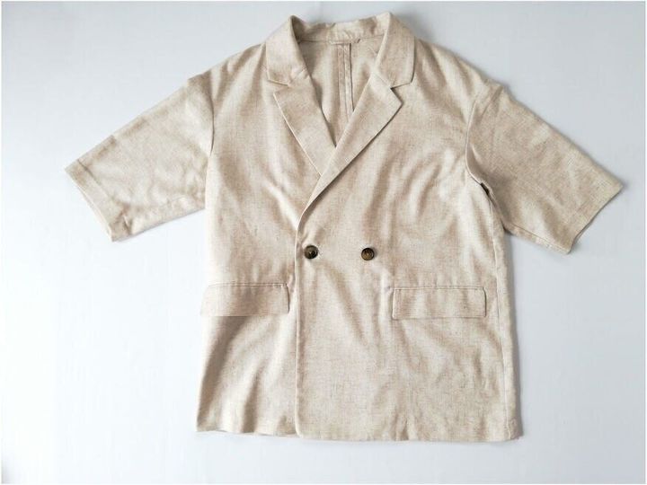 GUの「ハーフスリーブダブルブレストジャケット」は、お値下げされて990円(2021/7/1時点)。リネンのようなナチュラルな素材感が魅力。さっと羽織るだけで、今っぽくあか抜けた印象に見せてくれます。