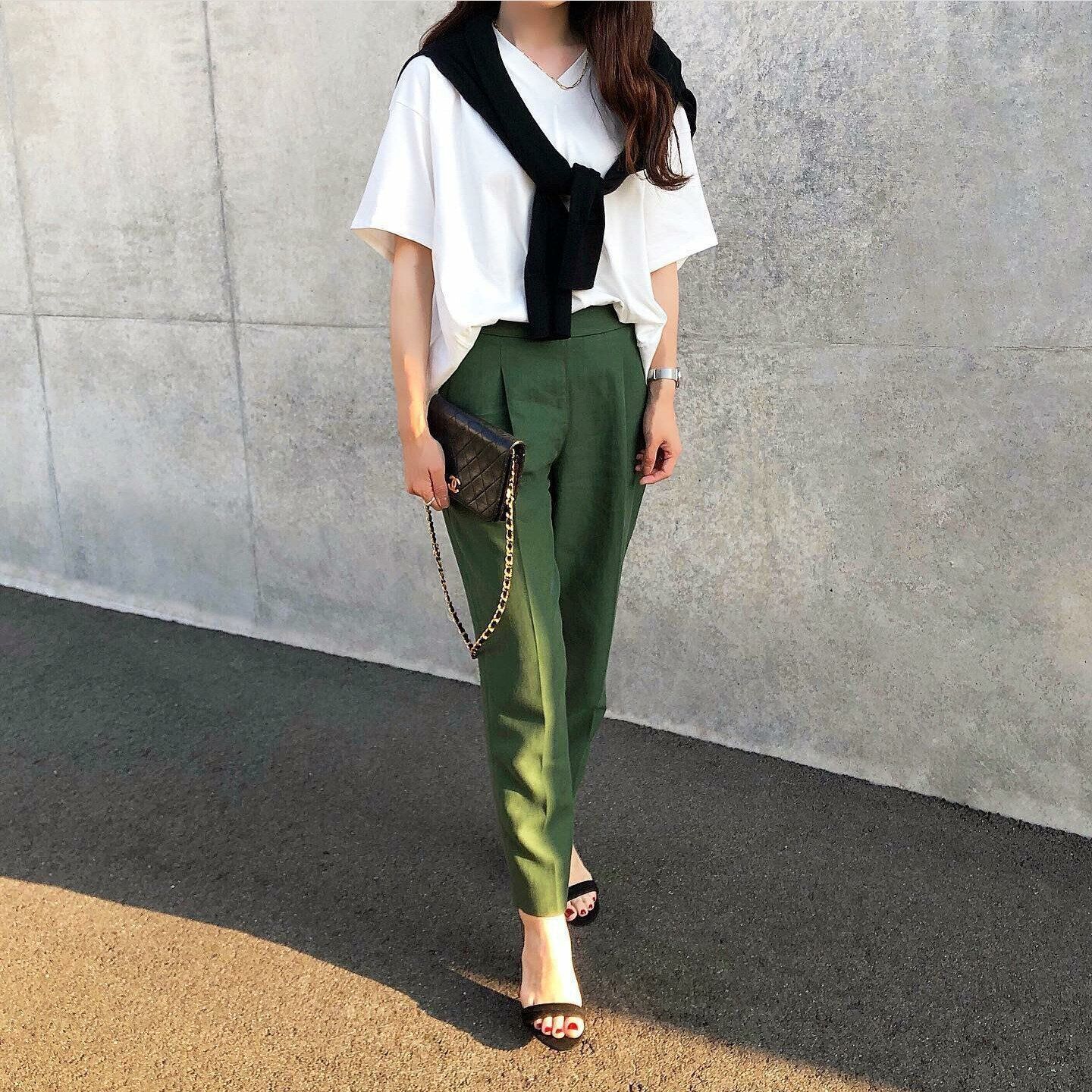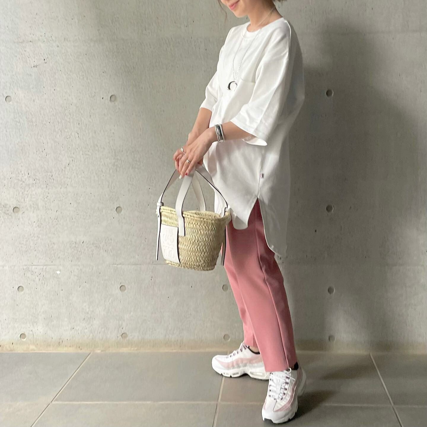 無地の白Tシャツこそ、大人の遊び心を加えてみるのもおすすめです。この夏は、鮮やかなカラーが素敵です。ピンク色もパンツで取り入れれば甘さは控えめ。辛口のスニーカーと合わせてクールに着こなすのが正解です。明るいカラーを取り入れることで気持ちまで明るくなれそう!