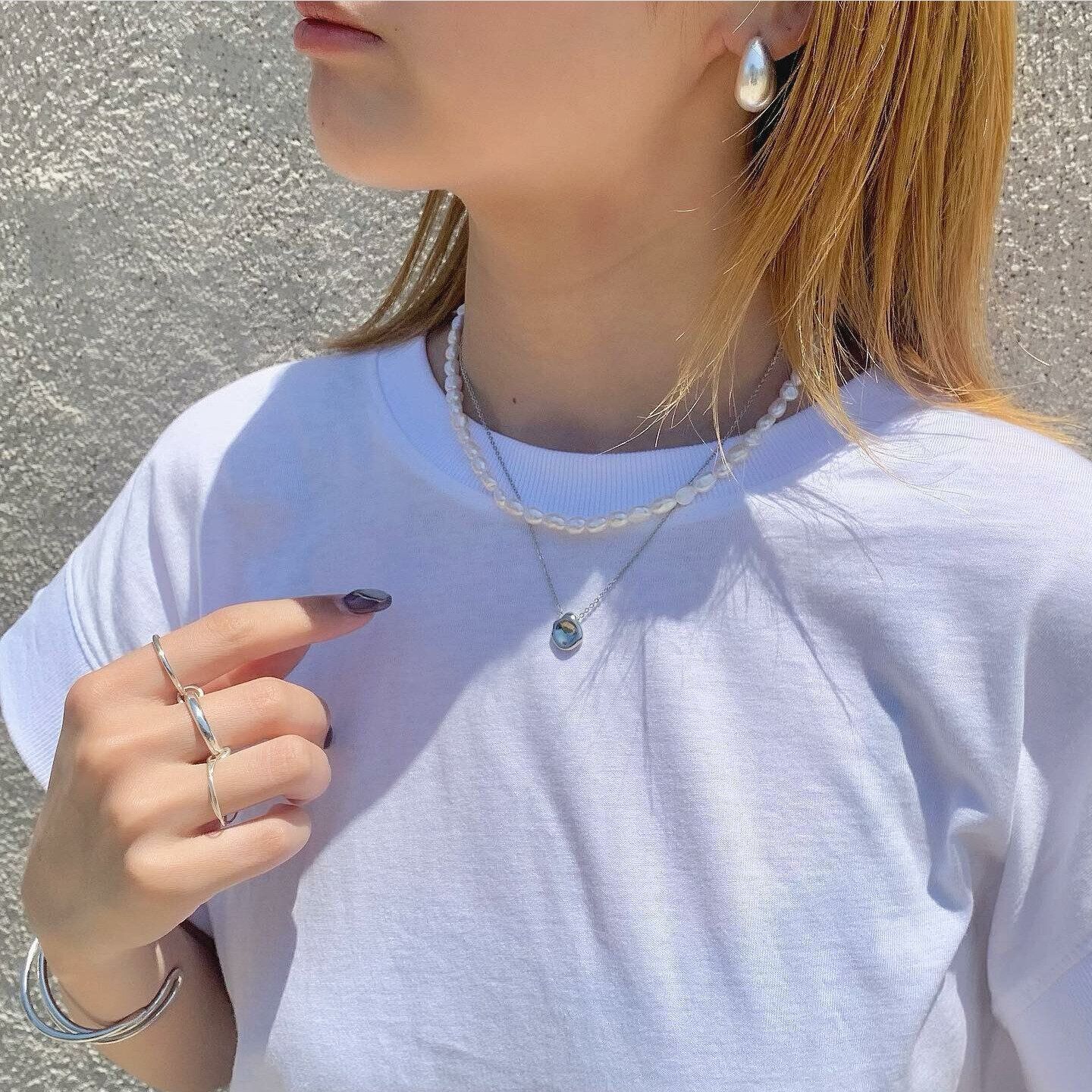 肌の露出が増える夏は、アクセサリーの重ねづけをしてみるのもいいでしょう。ネックラインはパールのネックレスと重ねづけして華やかに。かっこよさと女らしさをミックスさせた今っぽいスタイリングへと導いてくれます。