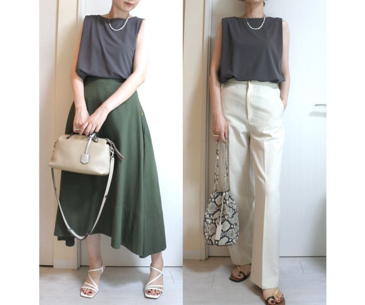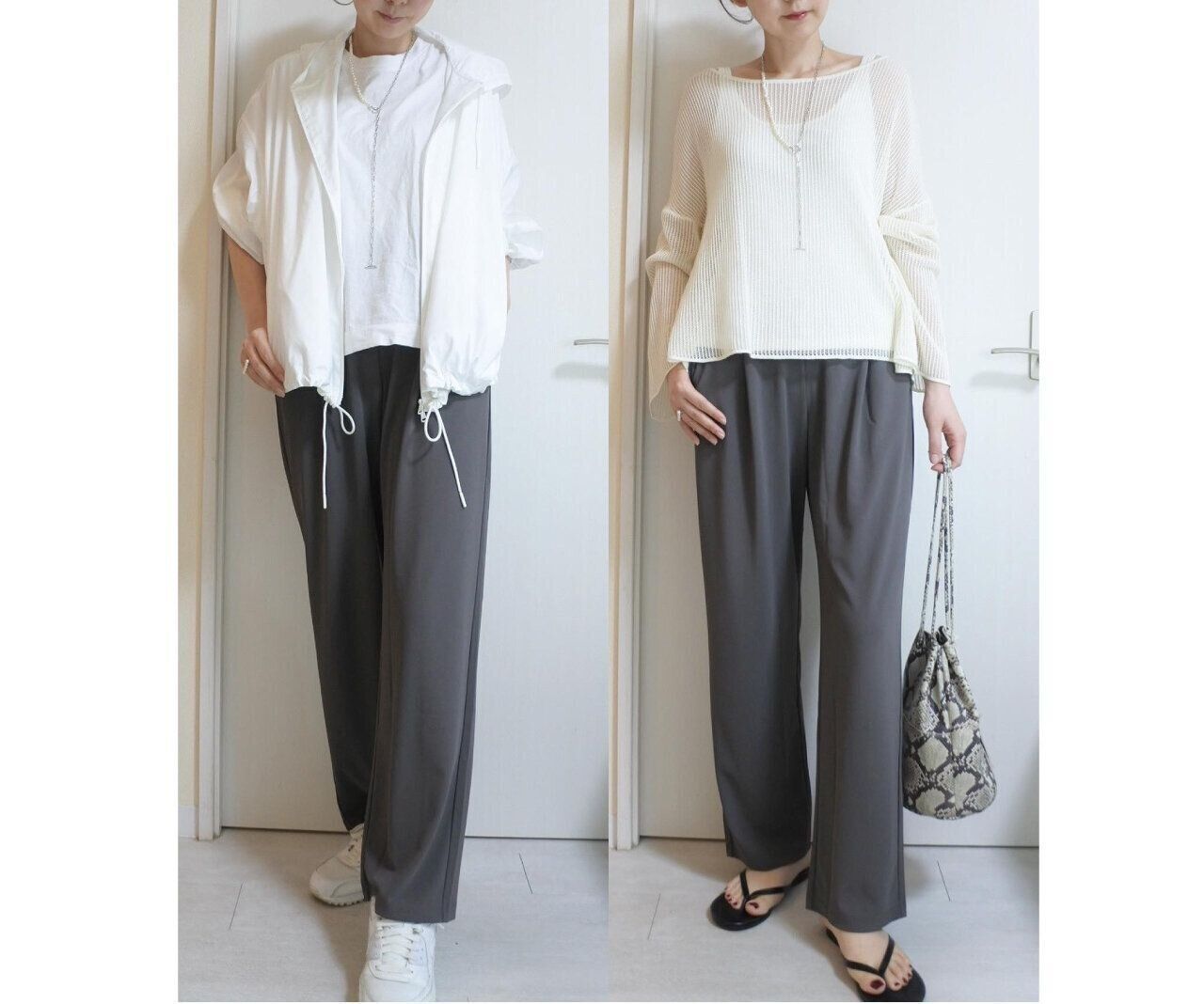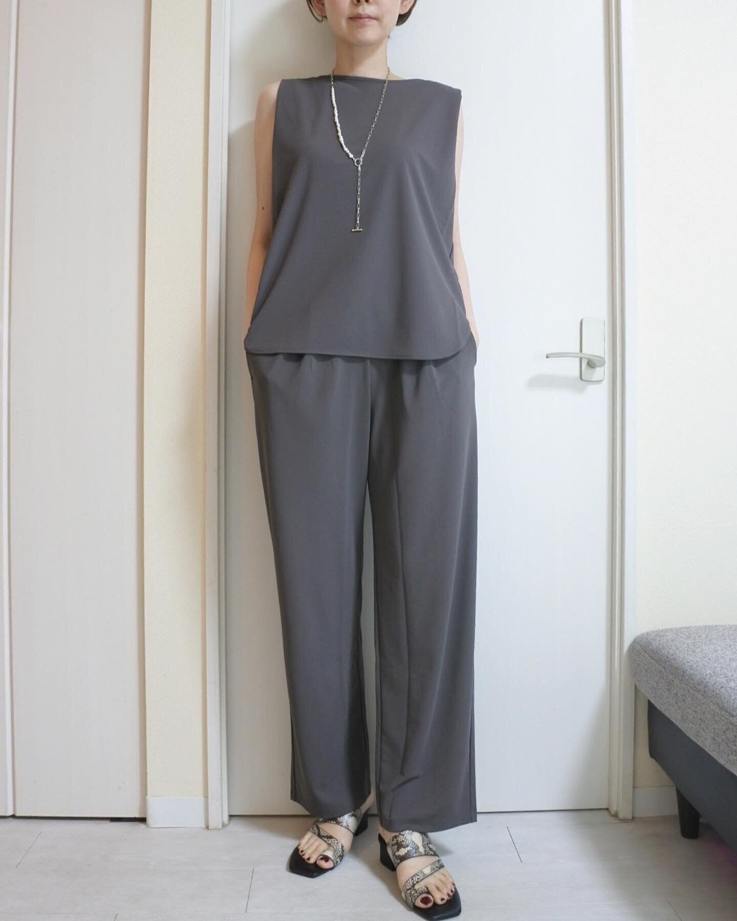 トップスと同素材のストレートパンツ。風通しもよく真夏も大活躍しそうです!