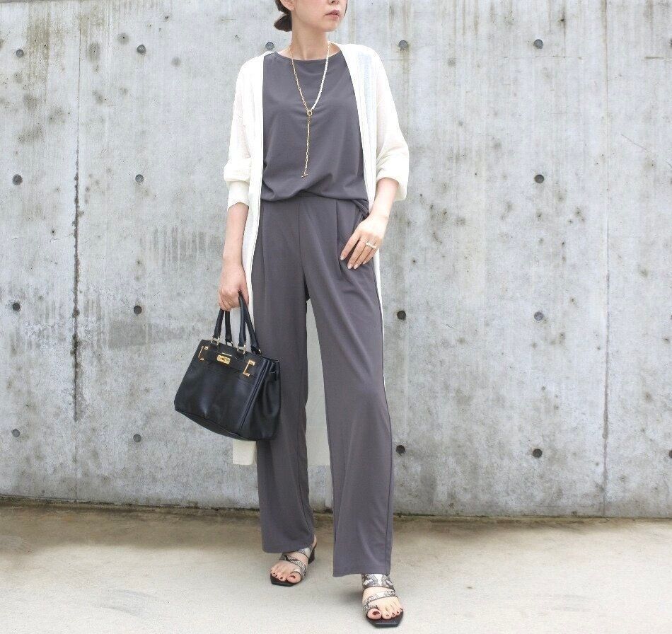何も考えずに上下セットで着てもおしゃれなセットアップとして完成!忙しい朝にも嬉しいですよね。二の腕が気になる方はロングカーディガンを羽織るのもおすすめです。