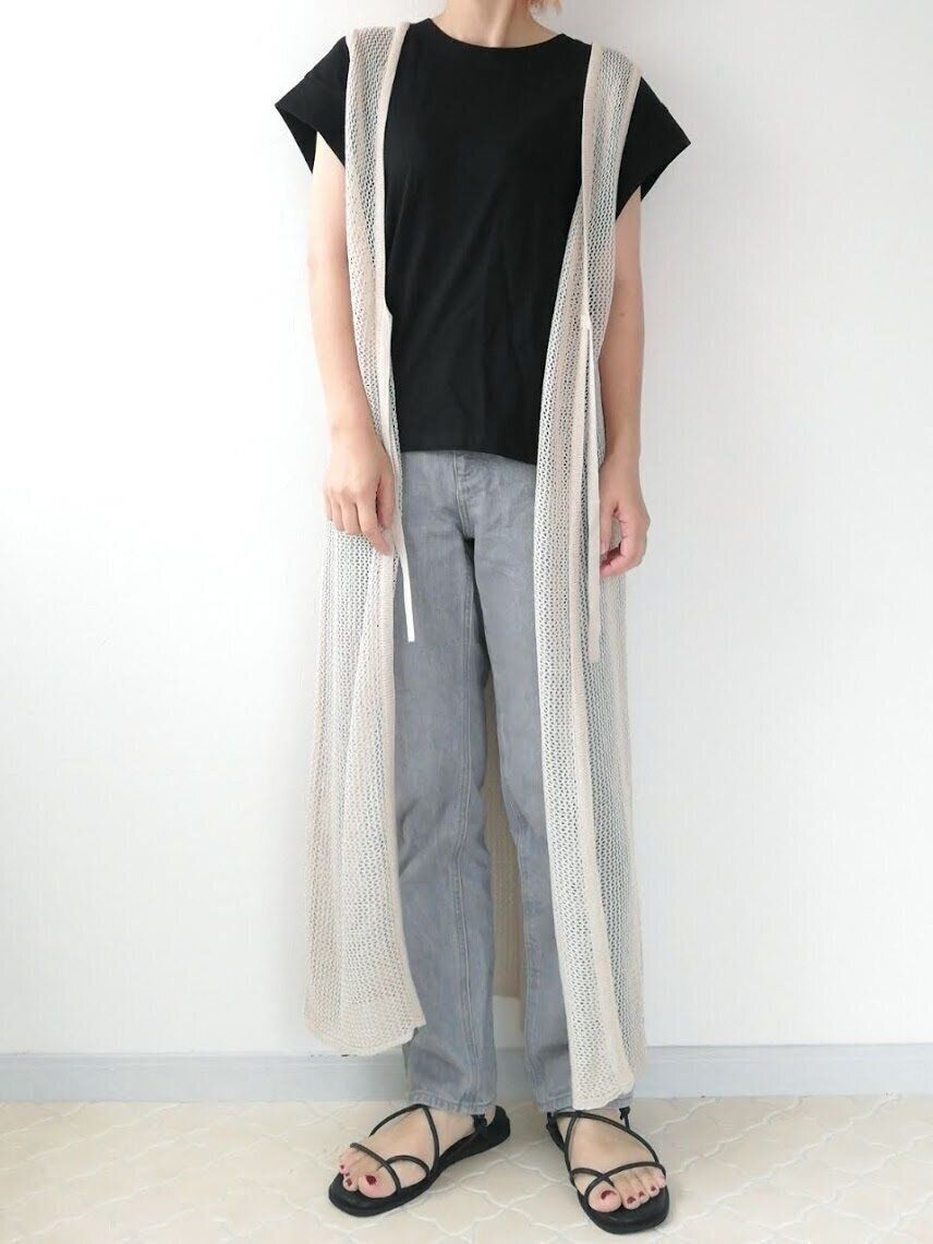ロング丈ジレでスタイリッシュな雰囲気がプラスされて、よりあか抜けた印象に。