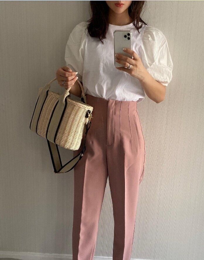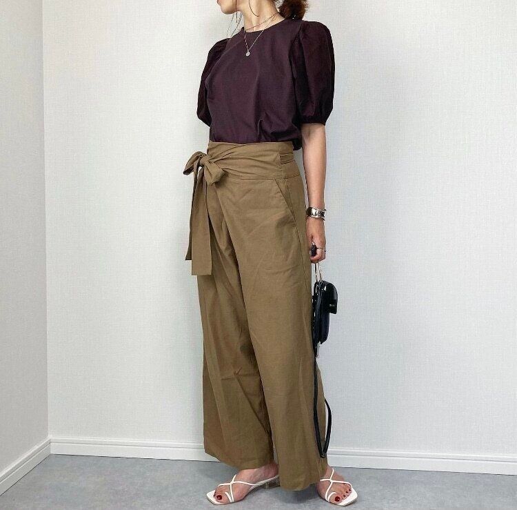 おしゃれ上級者向きのデザイン性の高いボトムスにも「布帛コンビネーションボリュームスリーブT」はボトムスをうまく引き立ててくれます。