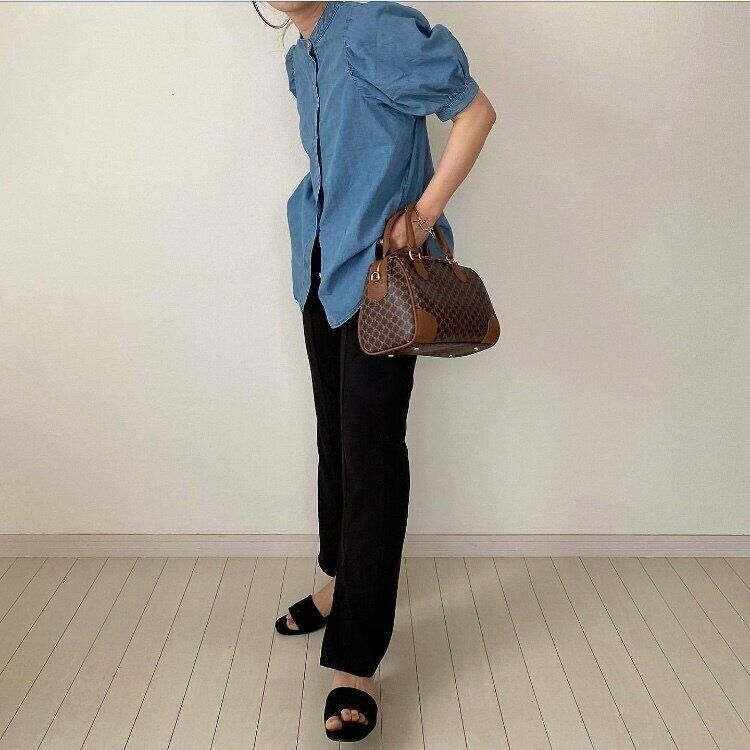 「デニムボリュームスリーブブラウス」と黒パンツとあわせ方は先ほどのコーディネートに似ていても、トップスをインするとまた違った印象になります。