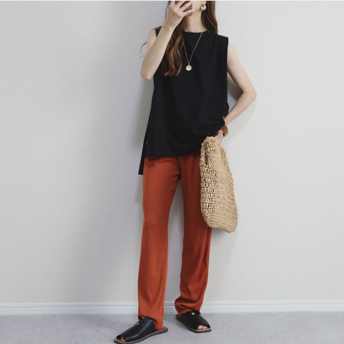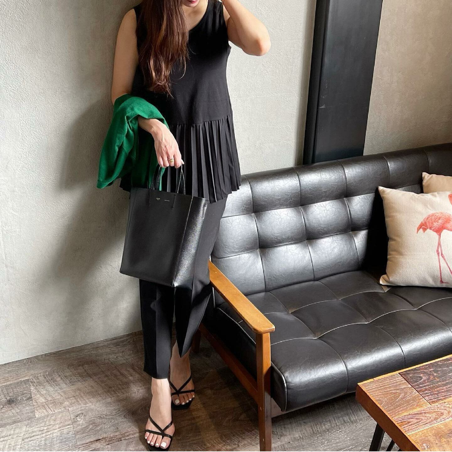 お仕事やきちんと感のある装いで出かけたいときは、「プリーツテールコンビネーションタンクトップ/990円」を手に取って。裾にプリーツデザインが施されているのでそのまま着るだけでも華やかな装いを約束。オールブラックで着こなせば、大人っぽさも。チープ感とは無縁の大人コーデが叶います。