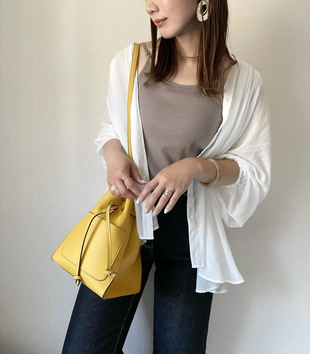 旬な巾着バッグは、レザー素材を選ぶことで大人らしい印象に。明るめイエローが持つだけでポイントになってくれそう!