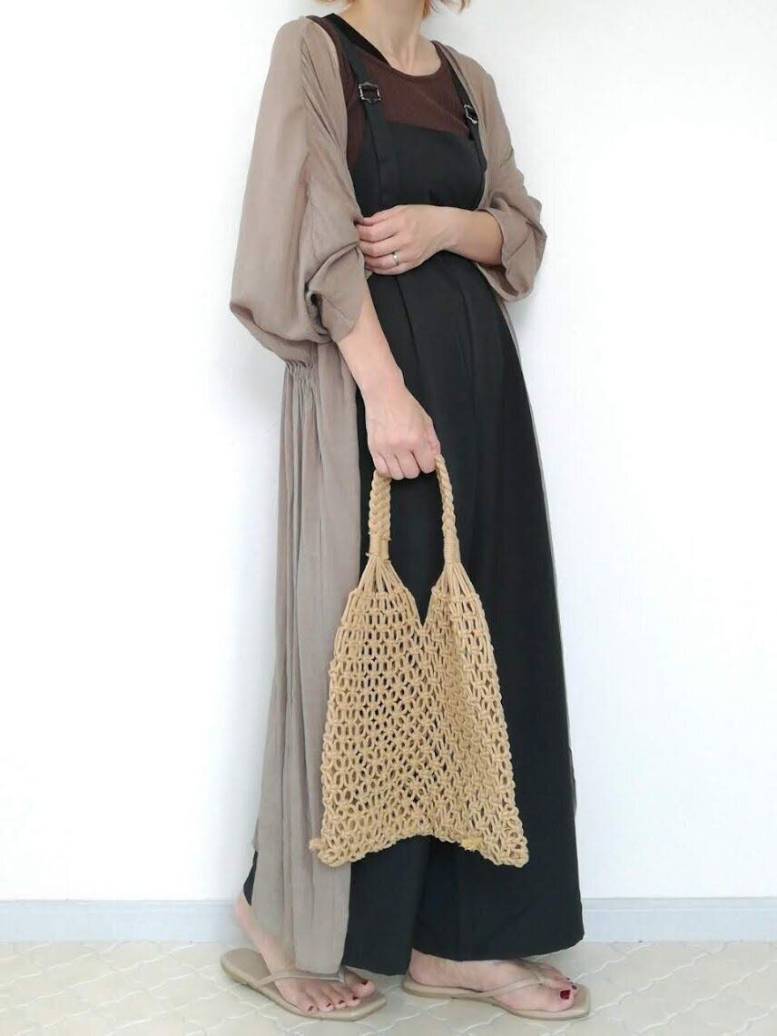二の腕を隠したい派のかたには、ゆるっとしたロングガウンがイチオシ。女らしさもプラスされて、サロペットコーデを美人見せすることができちゃいますよ。
