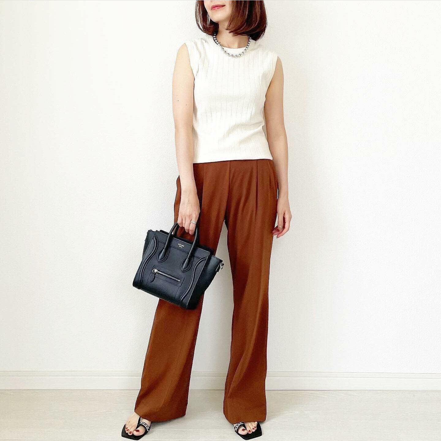身に着けるだけでグンと秋らしさが増すカラーといえば、深みのあるブラウン。ユニクロ×マメクロゴウチコラボの「エアリズムコットンタックパンツ/2,990円」は、赤みのあるブラウンがエレガント。真っ白のトップスでも秋らしさのある着こなしに。フレアになったシルエットで脚長効果も得られます。
