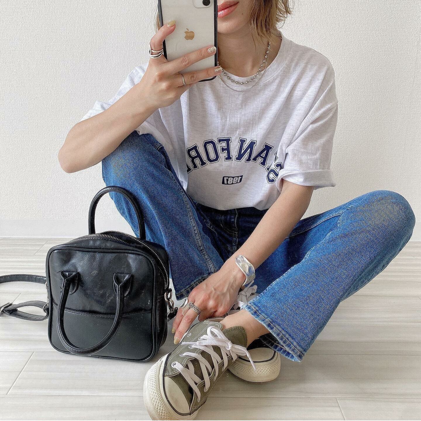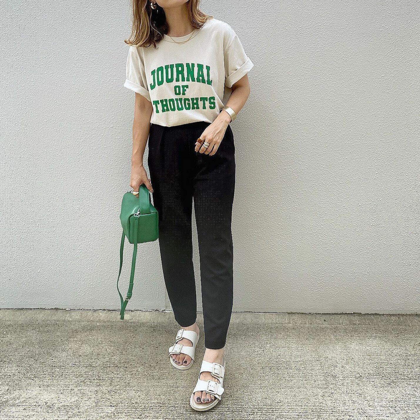 今年は、目を引くグリーンカラーを身に着けるオシャレさんが多いですよね。グリーンでなくても、アクセントカラーのバッグやシューズを身に着けるだけで、マンネリ気味なコーディネートを一新できます。苦手意識のない、好きな色から臆せずチャレンジしてみてください。こちらのコーディネートは、ロゴTシャツの色とリンクさせたスタイリングでより印象深く。