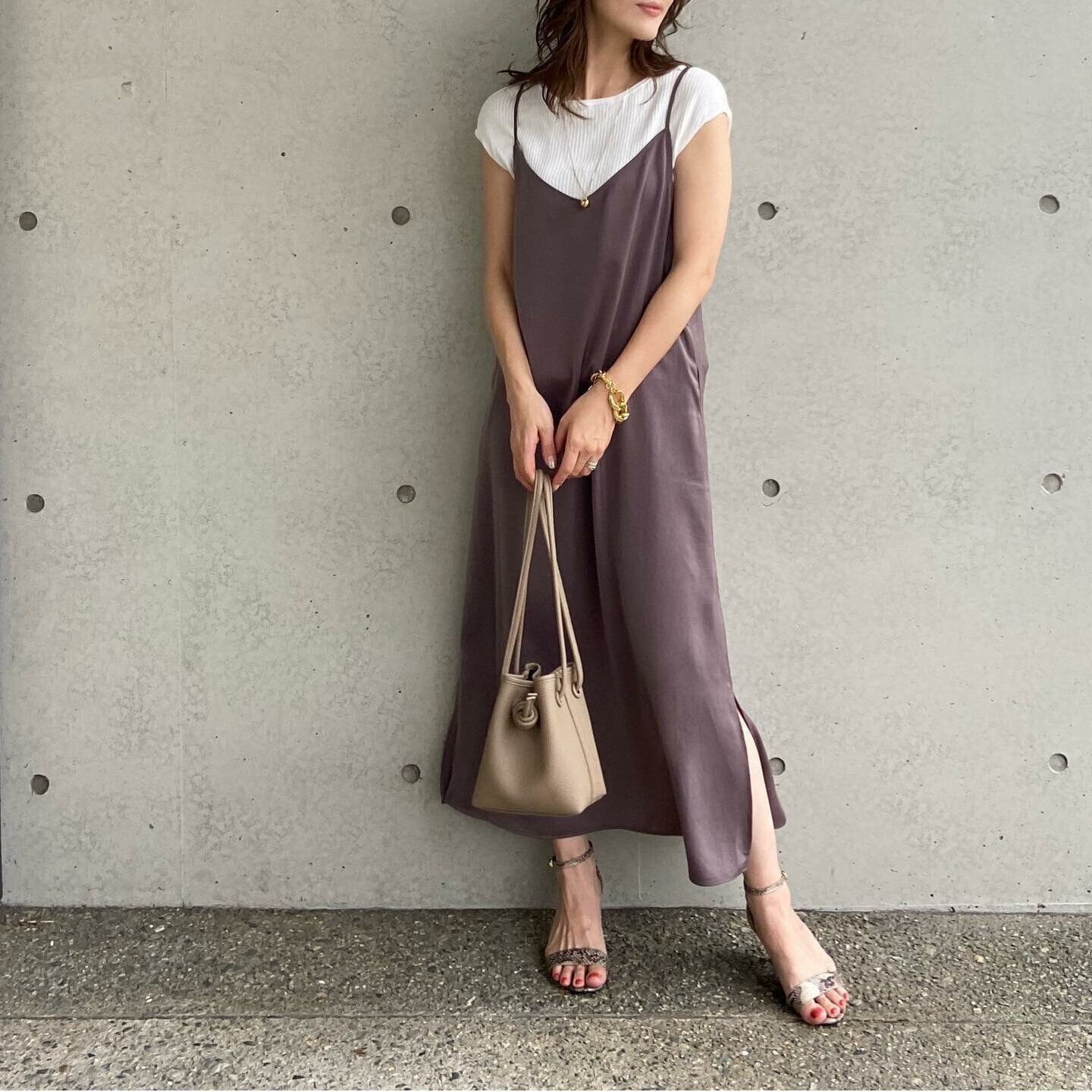 ベーシックで着回しのきくユニクロのトップスは、ジャンパースカートやキャミワンピ、オーバーオールのインナーに着ると変化が出せて◎。シンプルかつ二の腕がスッキリ見える「UVカットスーピマコットンフレンチスリーブセーター」(1,290円/2021年8月19日時点)も、キャミソールワンピースに合わせれば印象を変えて着こなせます。