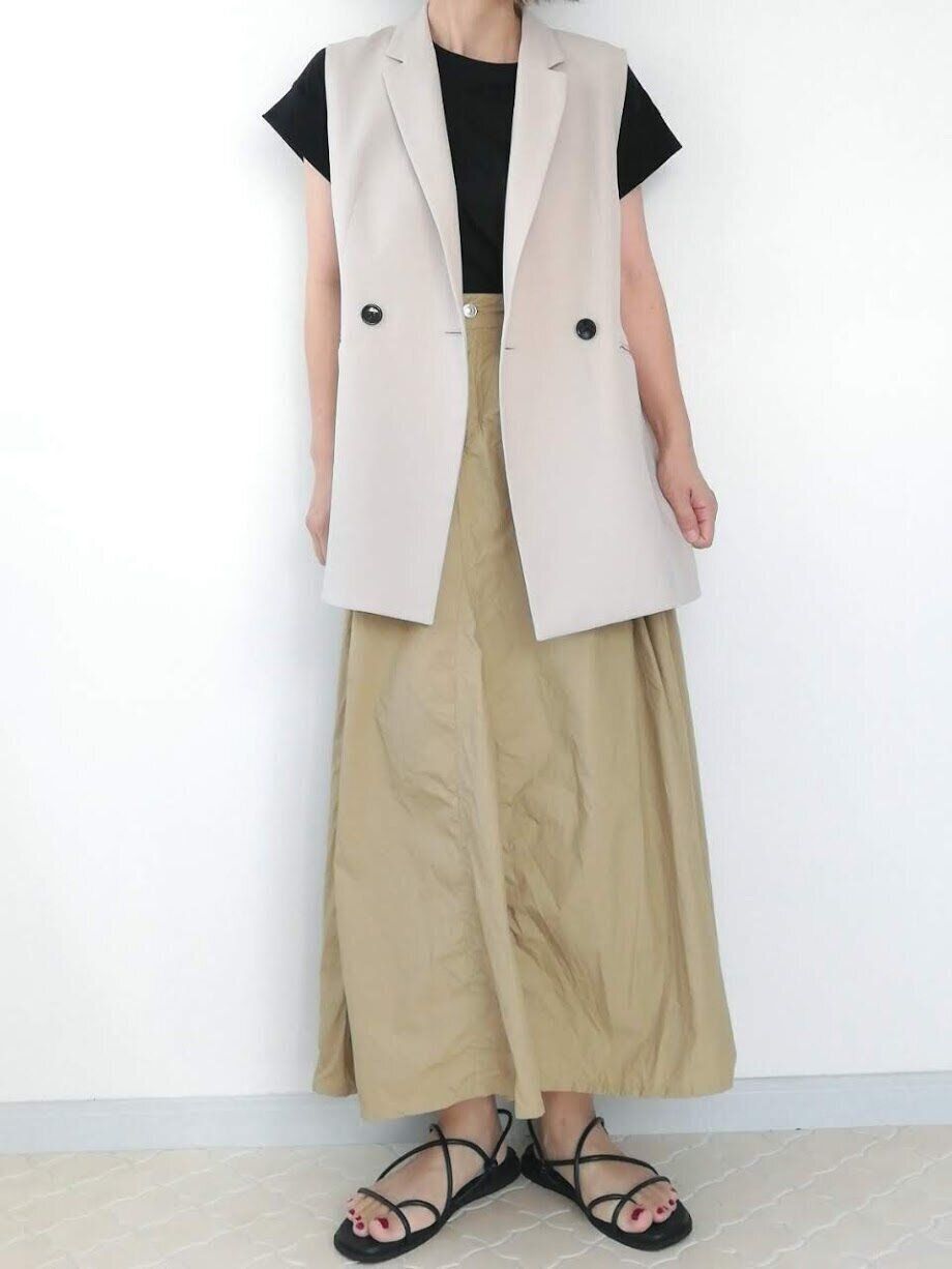 Aラインのロングスカートは重心が低くなるので、せっかくスタイリッシュなベストなのに、どこかやぼったい印象に見えてしまいます……。
