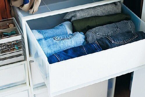 デニムやローゲージのニットなどは、つるさずに引き出しへ。引き出しの高さに合わせてたたみ、立てて収納。
