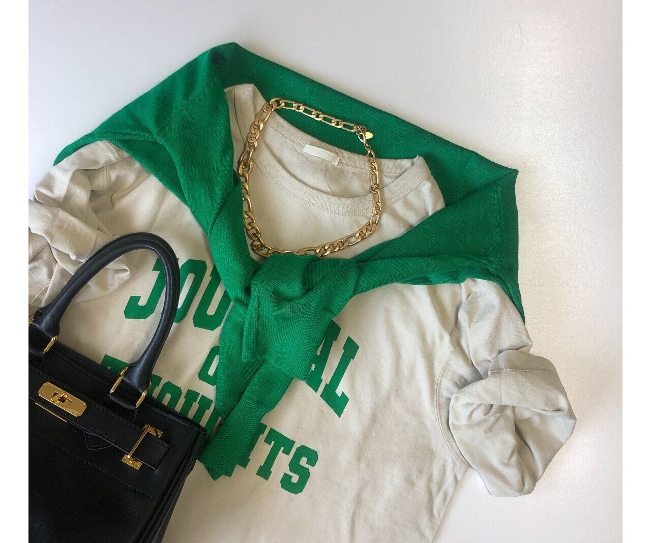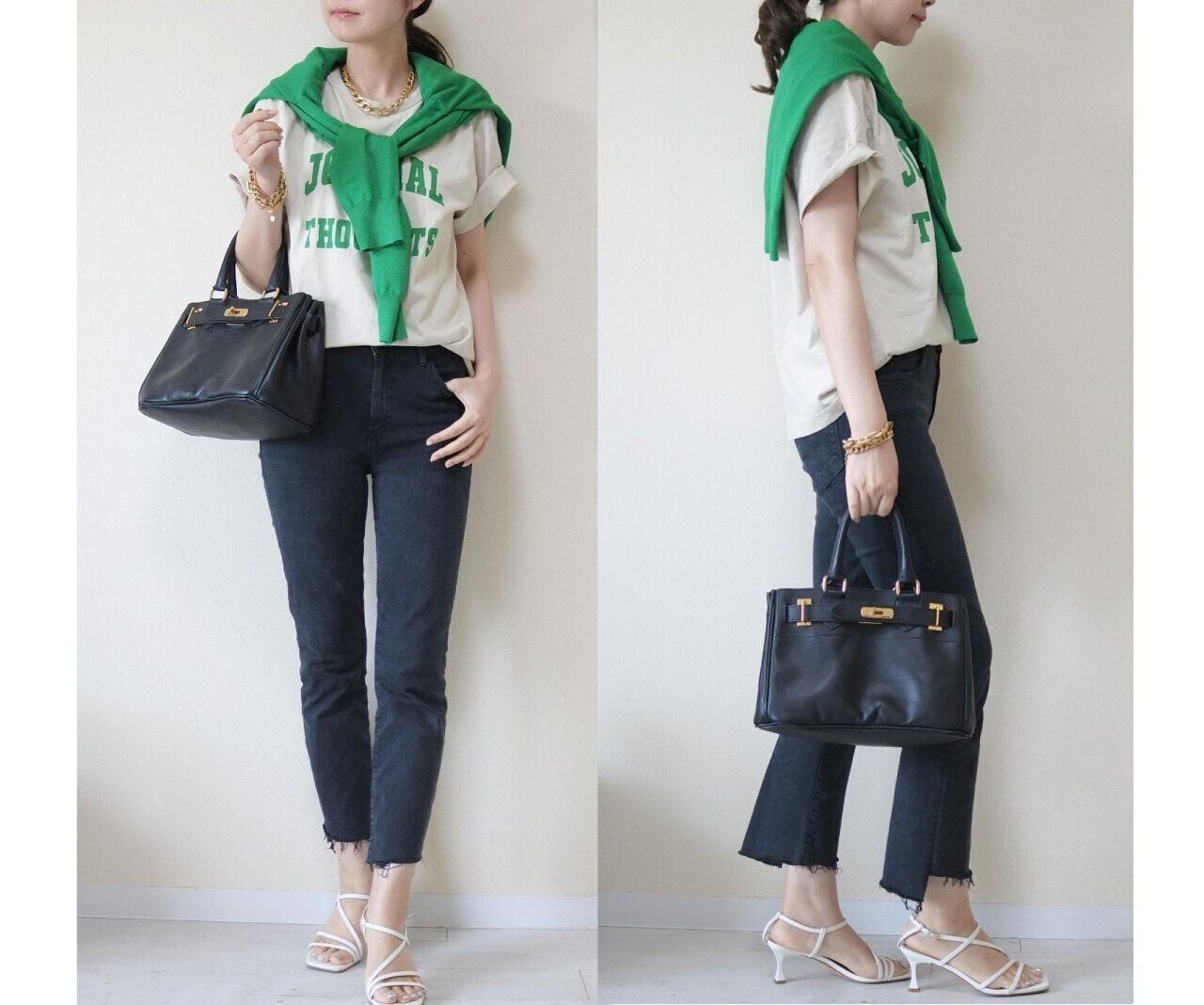ややルーズシルエットなので袖をくるくるまくってあげるとバランスが良いです。黒とグリーンの組み合わせも意外と相性抜群。アラフォー世代はまず黒と合わせてみるのがおすすめです。