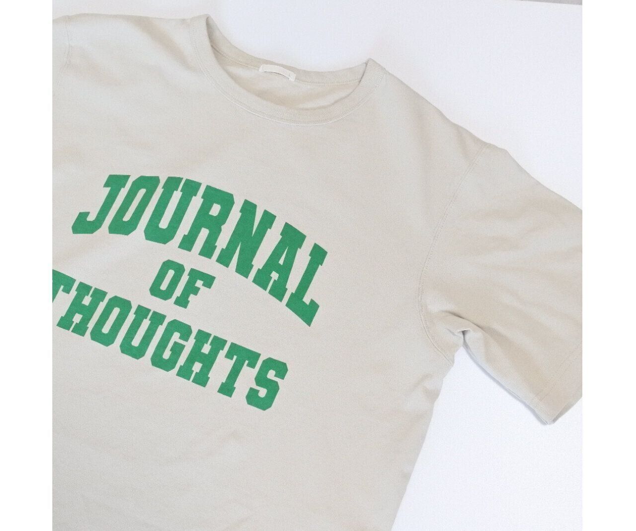 ロゴのビビッドなグリーンが目を引くカレッジロゴTシャツ。Tシャツのベージュの色が控えめなのでアラフォーでも取り入れやすいTシャツです。