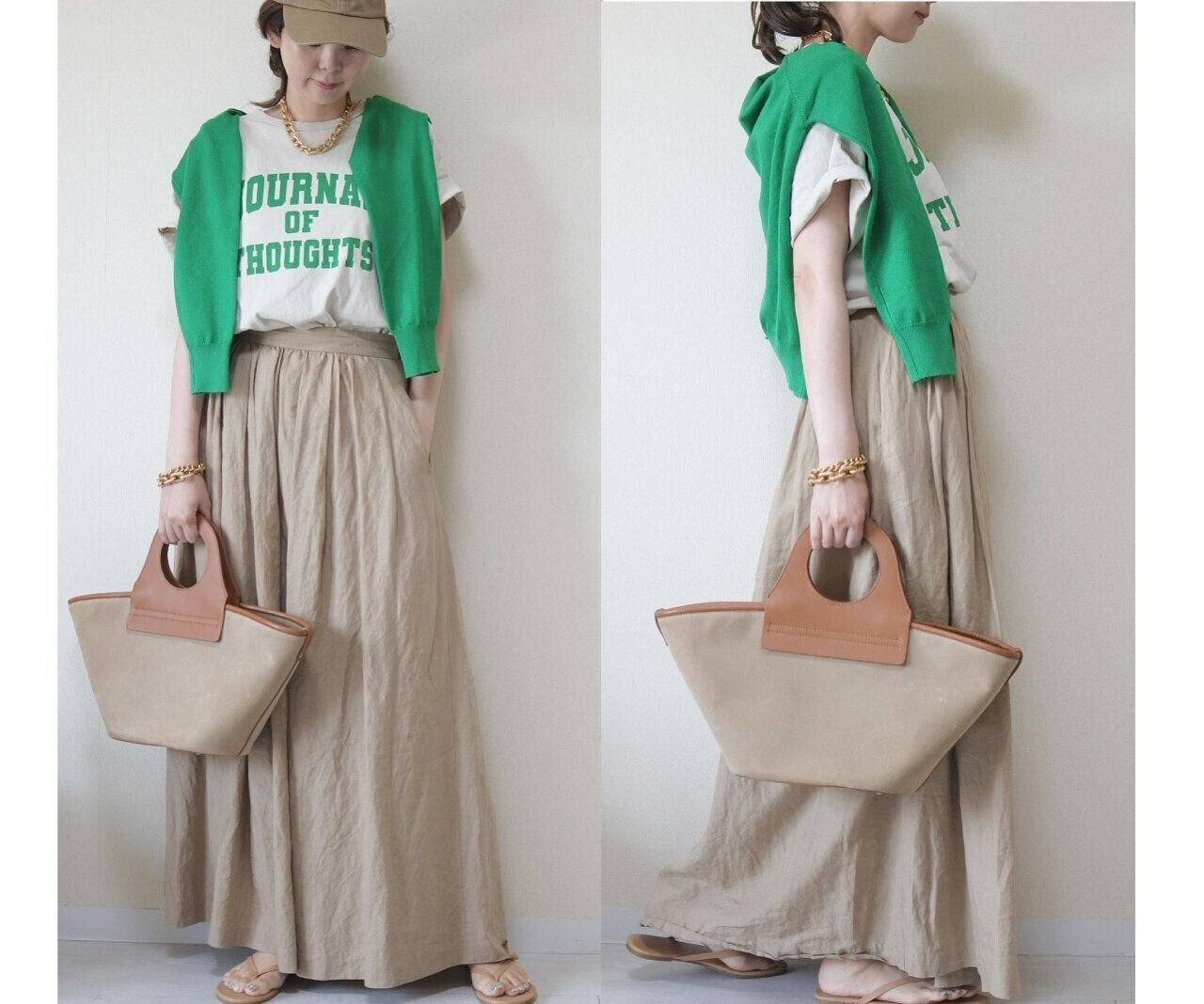 全体をベージュでまとめるとグリーンが悪目立ちしません。ボリュームのあるスカートの場合は裾をウエストインするとすっきりします。