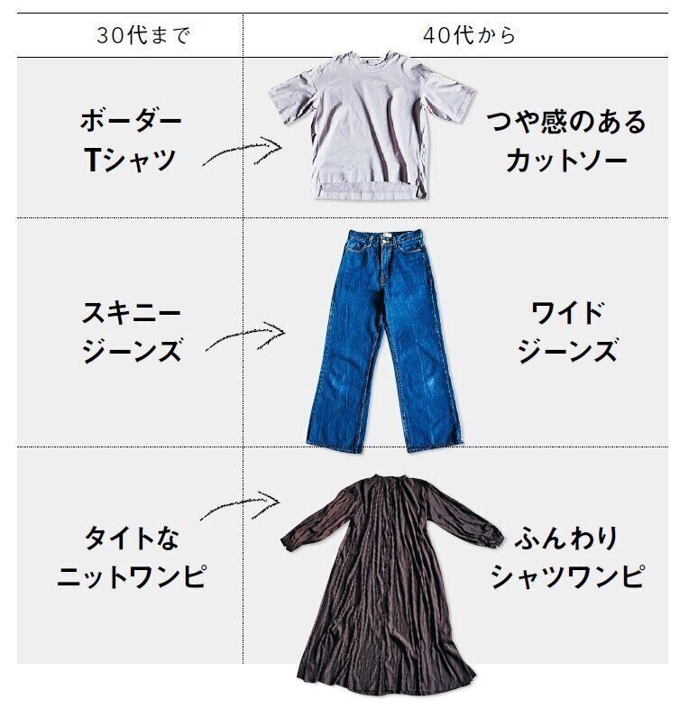 年を重ねると、似合う服は変わっていきます。40代になっても昔と同じ服を着ていると、イタい人に見えることも。カジュアルから、少しキレイめで体のラインを拾わない服にシフトしていくと◎。