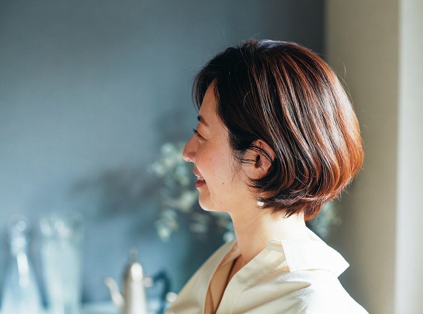 服がシンプルだと地味に見えたり手抜きに見えてしまう人は、髪の手入れに注力を。林さんは、白髪も気になるので1カ月半に一度は美容院に通っているそう。思い立ってすぐに行ける近所の美容院が行きつけ。