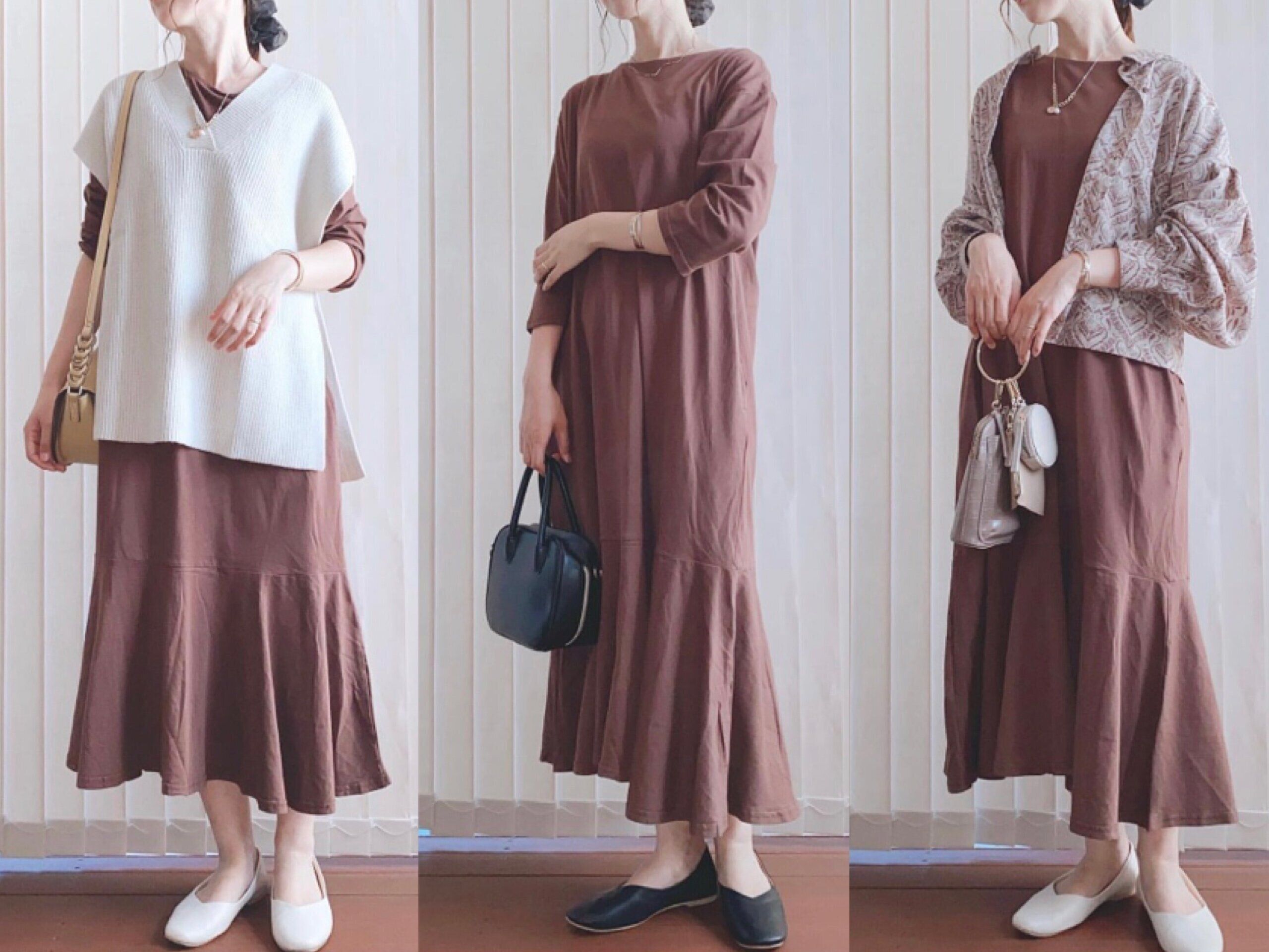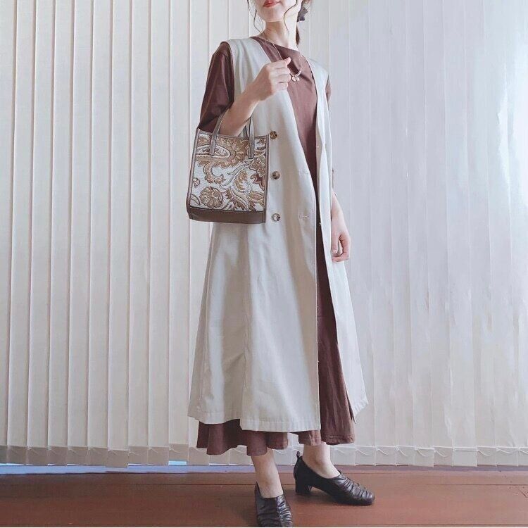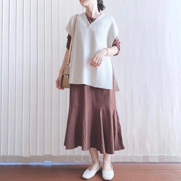 ワンピースは切り替え部分まではシンプルなシルエットなので、組み合わせるベストの丈も短めでも長めでももたついたり着ぶくれしたりしないので、重ね着スタイル初心者のかたでもチャレンジしやすいはず。