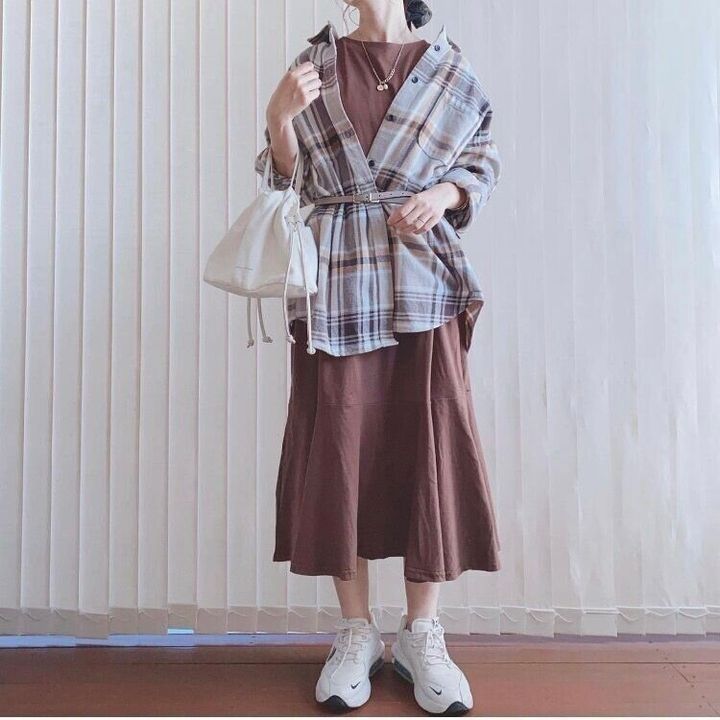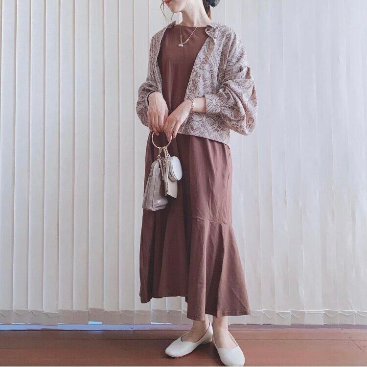 トップスに目線がいき背が高く見えるのでスタイルアップして見せるテクニックと、シャツとワンピースのカラーを統一させることでまとまった印象になる、テクニックが詰め込まれている計算しつくされたコーディネートです。