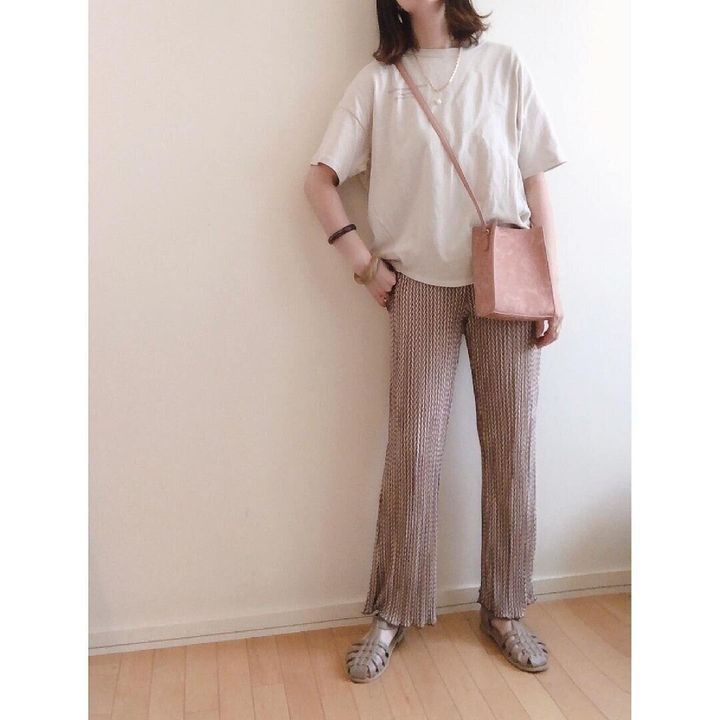 無地トップスに映える「柄プリーツパンツ」