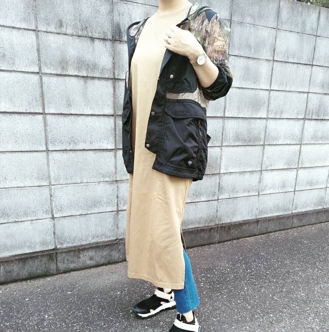 カモフラ柄のパーカーもワークマンのもの。メンズライクなミリタリーMIXコーデがかっこいい!