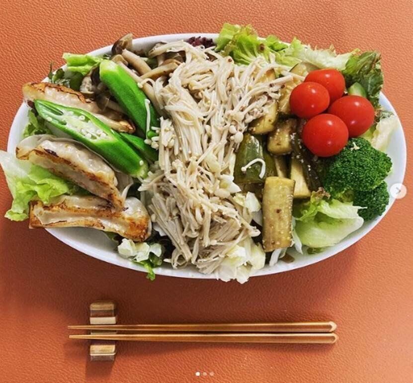 お気に入りはボリューム満点の「パワーサラダ」。パワーサラダとは、野菜やフルーツ、タンパク質などの具材がたっぷり入ったサラダのこと。1皿で必要な栄養をバランスよくとることができると注目されています。dieter_hamuyoさんのサラダのポイントは、旬の野菜に、オリーブ水煮やフルーツ、魚や肉、好きなゆで加減の卵、チーズなどをのせるのもお気に入り。今日は、家族用に買った餃子を食べたくなってちょっといれてみたそう。こんなごほうびもときにはいいですよね。