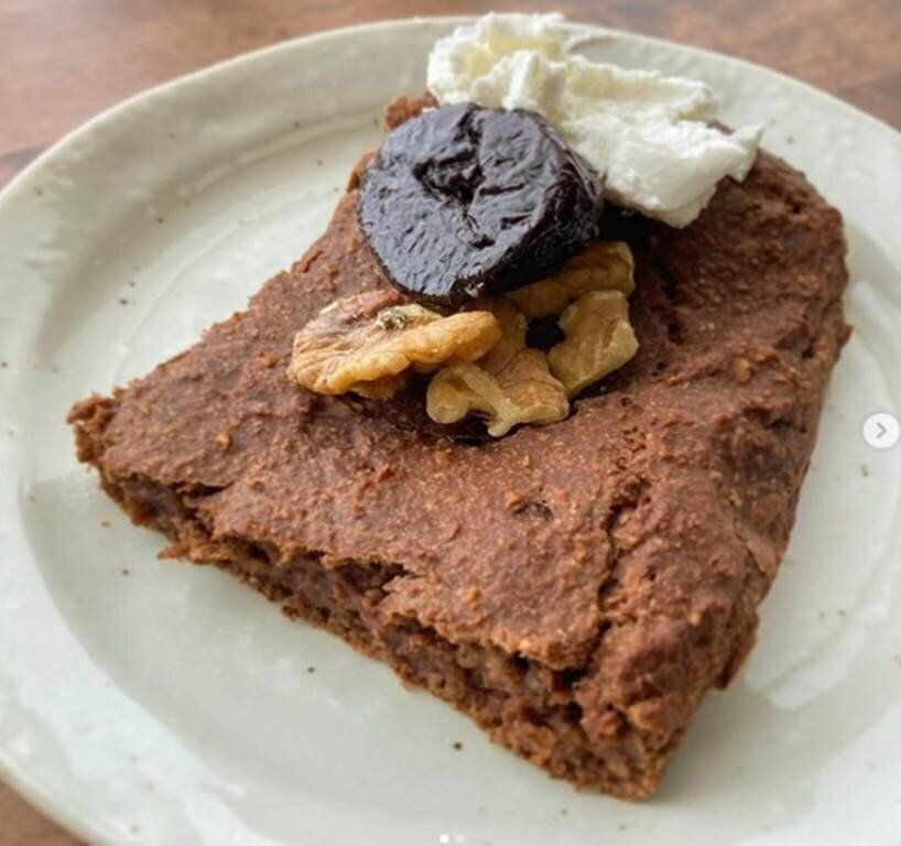 スイーツを手づくりして甘いものを食べたい欲求を満たすというdieter_hamuyoさん。こちらは、オートミールでつくったバナナケーキ(プルーンとくるみとカッテージチーズのせ)です。いろいろと試しながら心も満足させるダイエットを続けています。これこそがダイエット継続のコツなんですね!