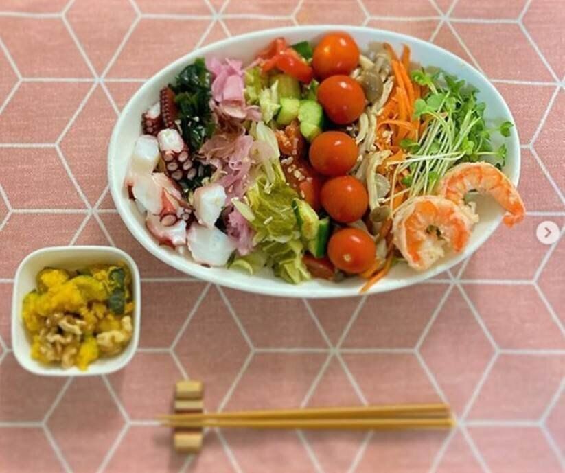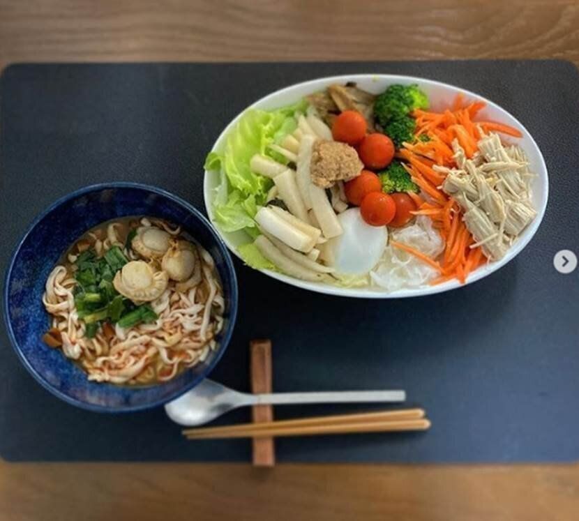 疲れた日は、晩ごはんを多めにして元気を補充するそう。パワーサラダに、こんにゃく麺入りのトムヤムスープを添えています。温かい汁物は体をほっとさせてくれますね。