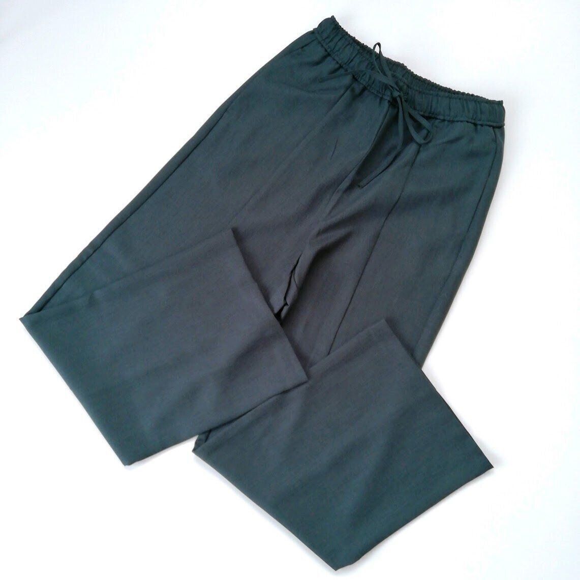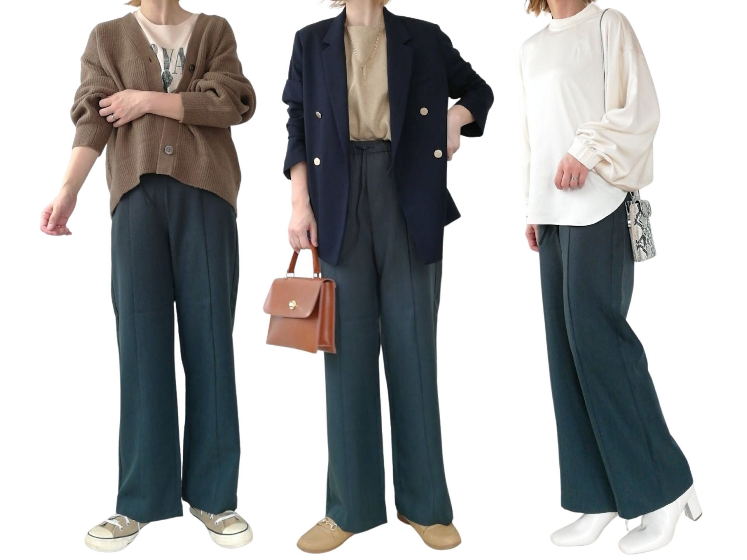 GUの「センターシームドローストリングセミワイドパンツ」、これから買うならトレンドカラーの「グリーン」がイチオシ。落ち着いた「グリーン」なので、40代も抵抗なく取り入れることができるんです。